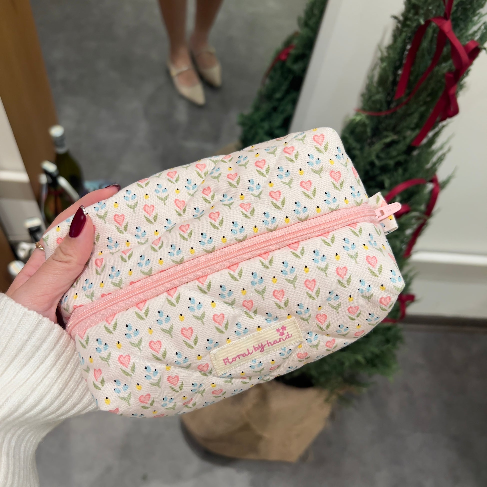 Weiche gesteppte Kosmetiktasche mit Hasenfreunden, Rosa Blumenmuster, handgefertigt