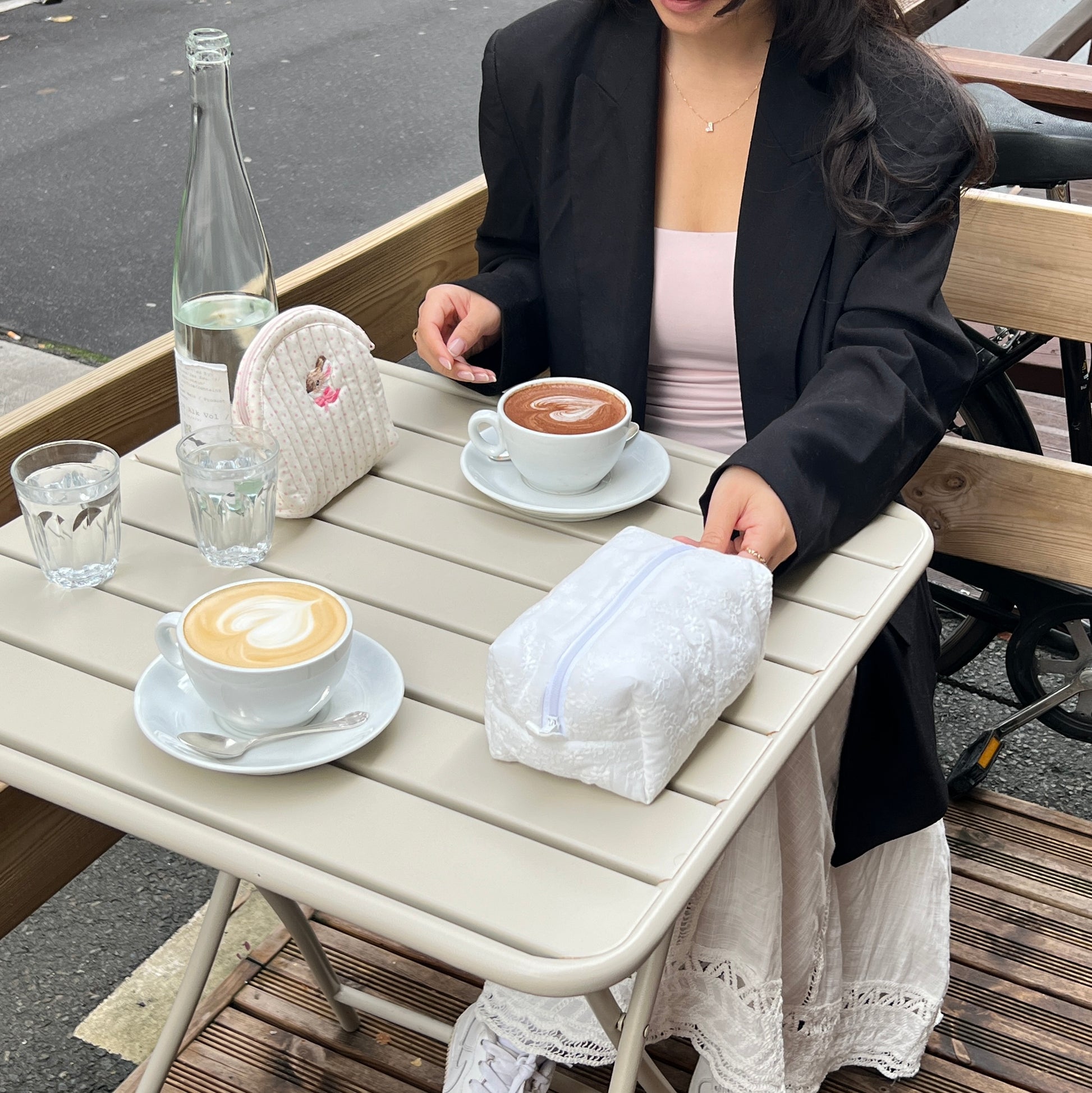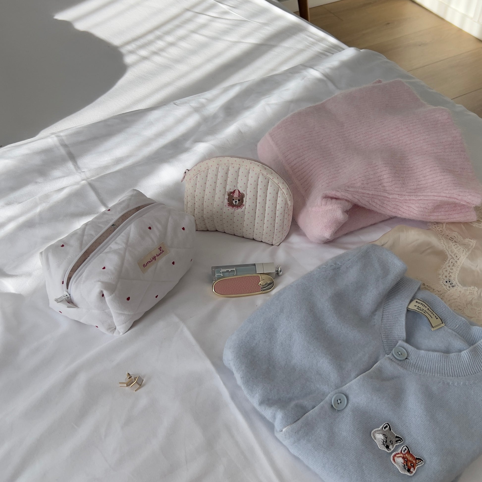 Featuring petite bunny or bear 100% hand-embroidery on white/pink polka dots.